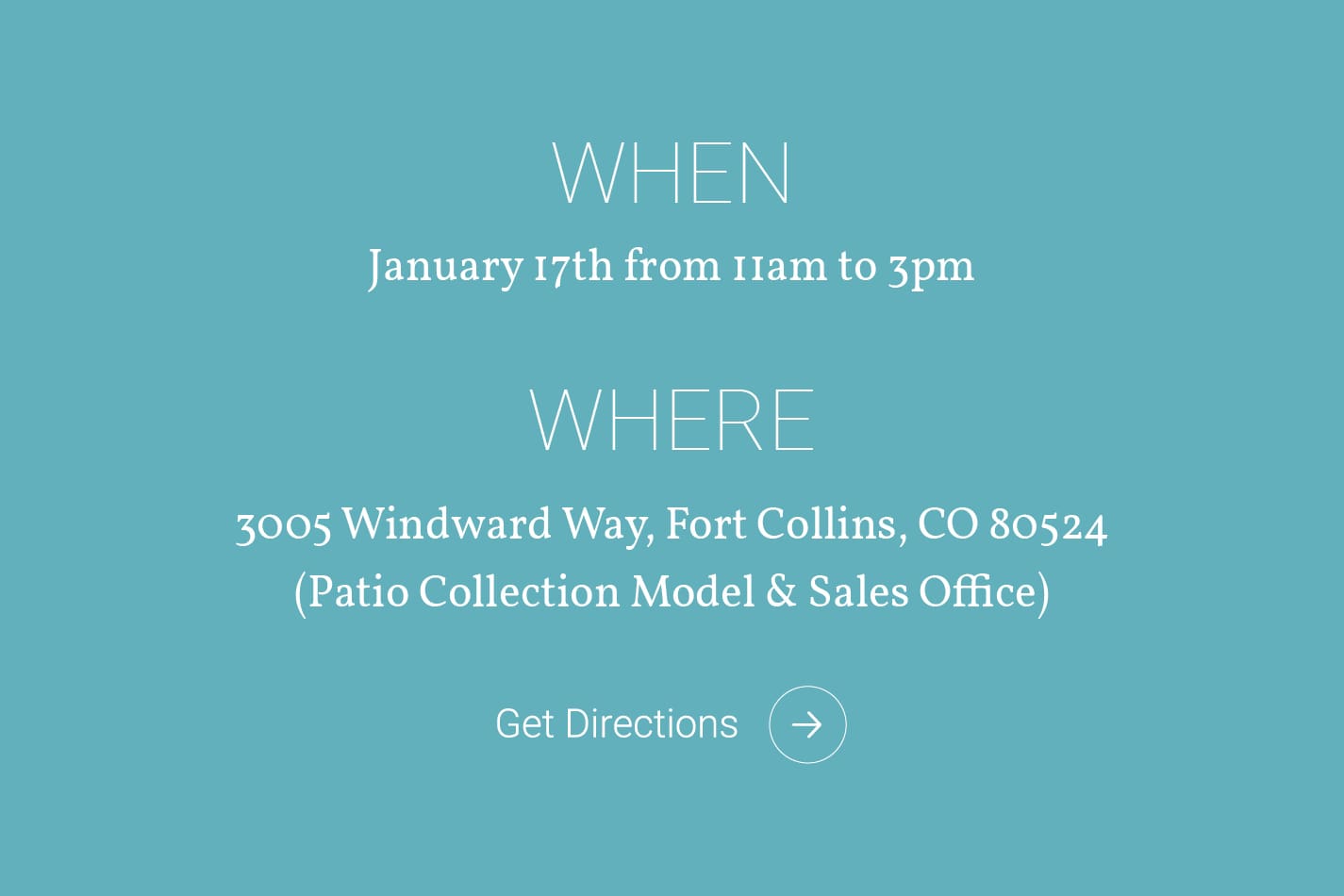 WHERE: 3005 Windward Way, Fort Collins, CO 80524 (Patio Collection Model & Sales Office)